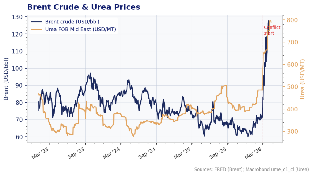 In short, there is no clear evidence that the Hormuz disruption is feeding through to retail food prices just yet. But the forward-looking picture is less reassuring. Urea spot prices have surged from roughly $500/MT to close to $800/MT in under six weeks, a move that, if sustained, will eventually reach farm-gate input costs and from there the supermarket shelf (Figure 2). We will continue tracking these indices closely in the months ahead.