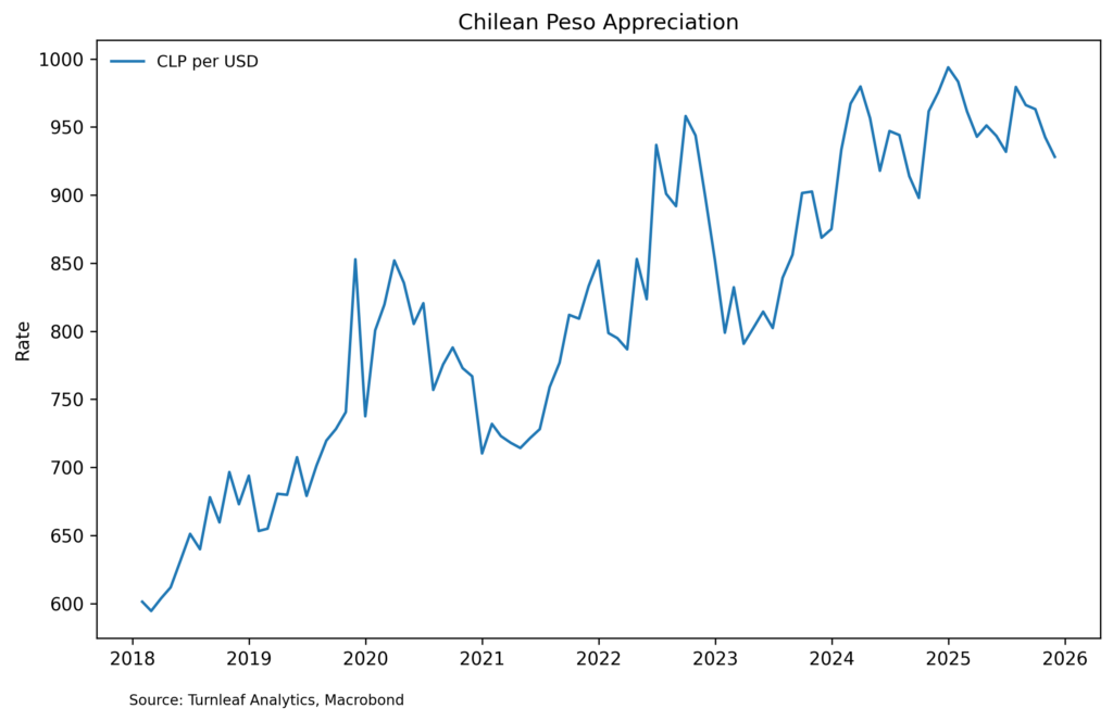 Chilean energy prices have decelerated notably in recent months, driven primarily by peso appreciation, which has reduced the local-currency cost of dollar-priced energy inputs, and lower global oil prices. As the CLP strengthened by roughly 8% against the USD since mid-2024, dollar-denominated electricity contracts translated into lower peso costs, offsetting underlying operational pressures (Figure 2)
