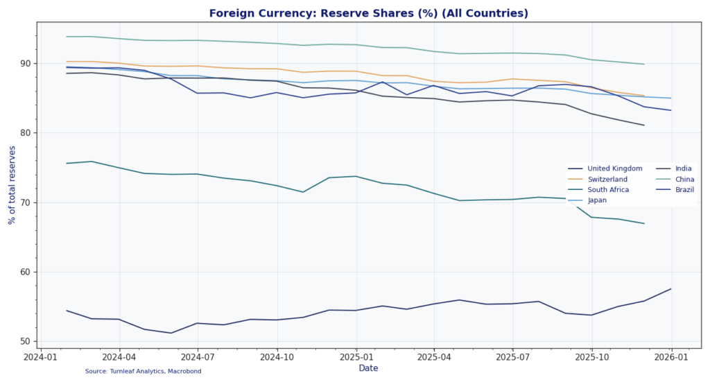 2) The relationship between reserve composition and currency volatility has tightened, particularly in economies where gold now represents a growing share of total reserves relative to foreign currency holdings.