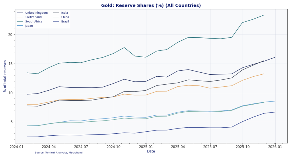 Central banks across emerging markets and select advanced economies have accelerated gold accumulation, shifting the composition of international reserves in ways that signal declining confidence in dollar-denominated assets and heightened concern over financial stability (Figure 3a & 3b).