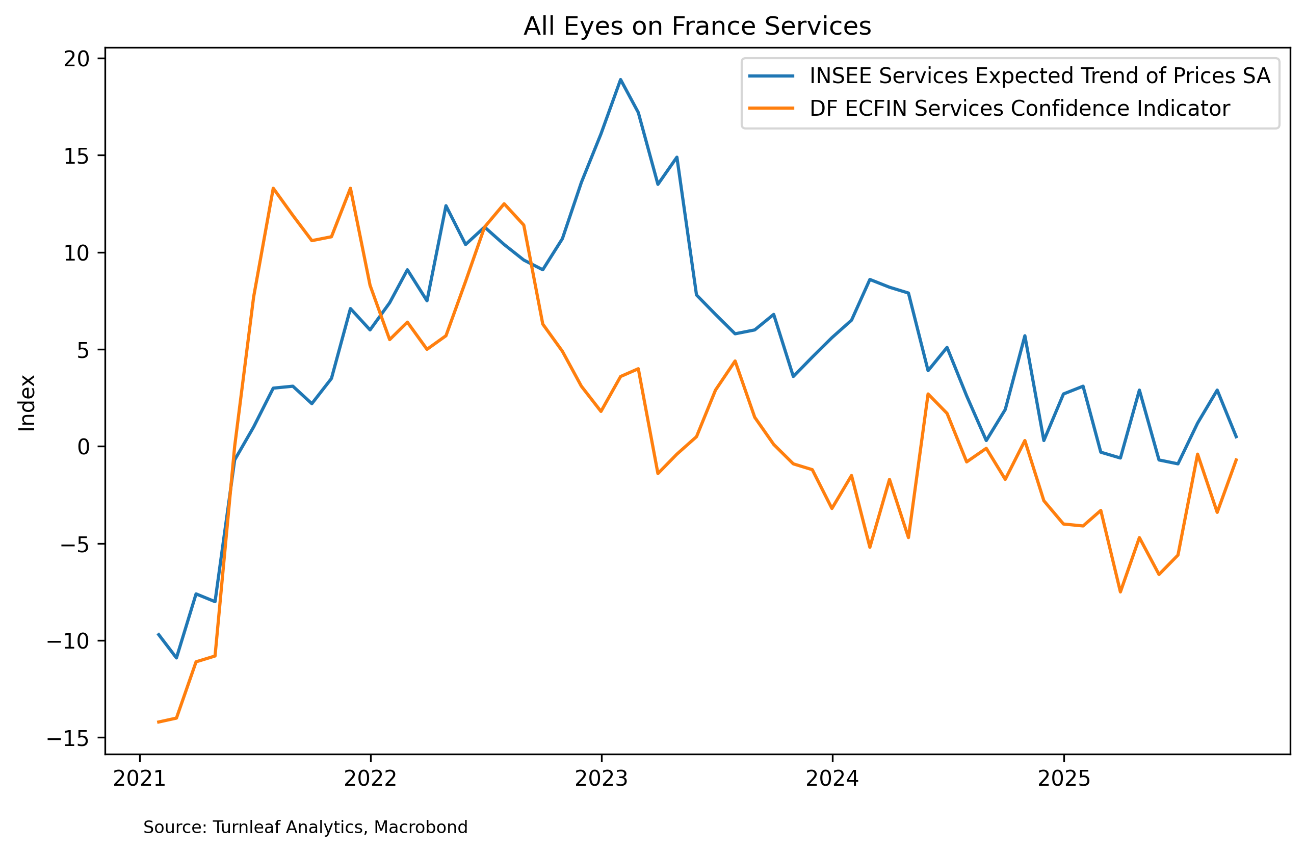 Consumers are waiting for something bad to happen. Industrial weakness and worries about the government dominate the story, and French households are preparing for the worst. As discussed in earlier posts, unemployment concerns are pushing precautionary saving higher and discretionary spending lower. That shift has kept inflation close to 1% YoY, with the balance of risks pointing toward further disinflation. Setting aside cyclical dynamics, Turnleaf’s models are emphasizing consumer behavior. French households are engaging with the economy differently and pulling back from the sectors that used to carry growth.