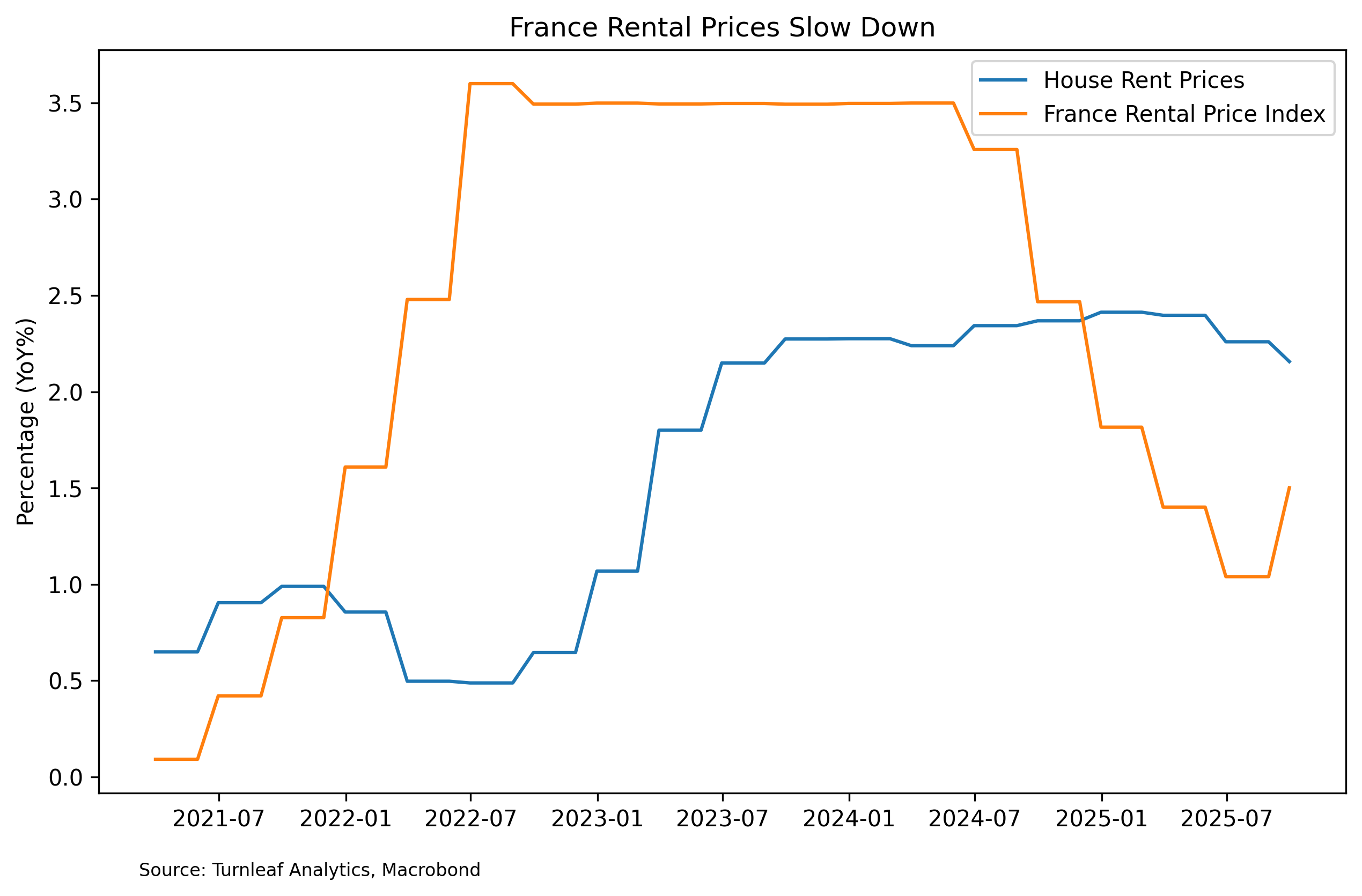 The housing channel tells a similar story and is illustrated in Figure 3. France’s rent revisions are governed by the Indice de Référence des Loyers (IRL), which is tied to CPI ex-tobacco. As disinflation took hold through 2024, the IRL fell from about 3.3% to near 1% by mid-2025, mechanically capping permissible rent increases and cooling housing services. It edged back toward 1.5% late in the year, but with most leases revised annually, the near-term passthrough should be modest. This helps reconcile the model signals. House rent prices are still running a little above 2% YoY and thus flags as inflationary, while the IRL, having dropped sharply, flags as disinflationary. In other words, current rent levels remain elevated, but the lower benchmark constrains upcoming revisions, so any lift from rents in the next prints should be limited rather than a new source of upside pressure.