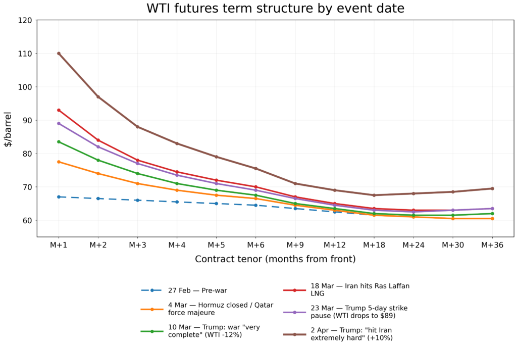 Subsequent periods of de-escalation eased pressure at the front of the curve, but they did not reverse the rise further out. By 2 April, front-month WTI was at $110, while M+36 remained at $69.5, still nearly $9 above its pre-war level. The market expects the worst of the immediate shortage to ease, but it is still pricing in a higher medium-term energy cost backdrop.