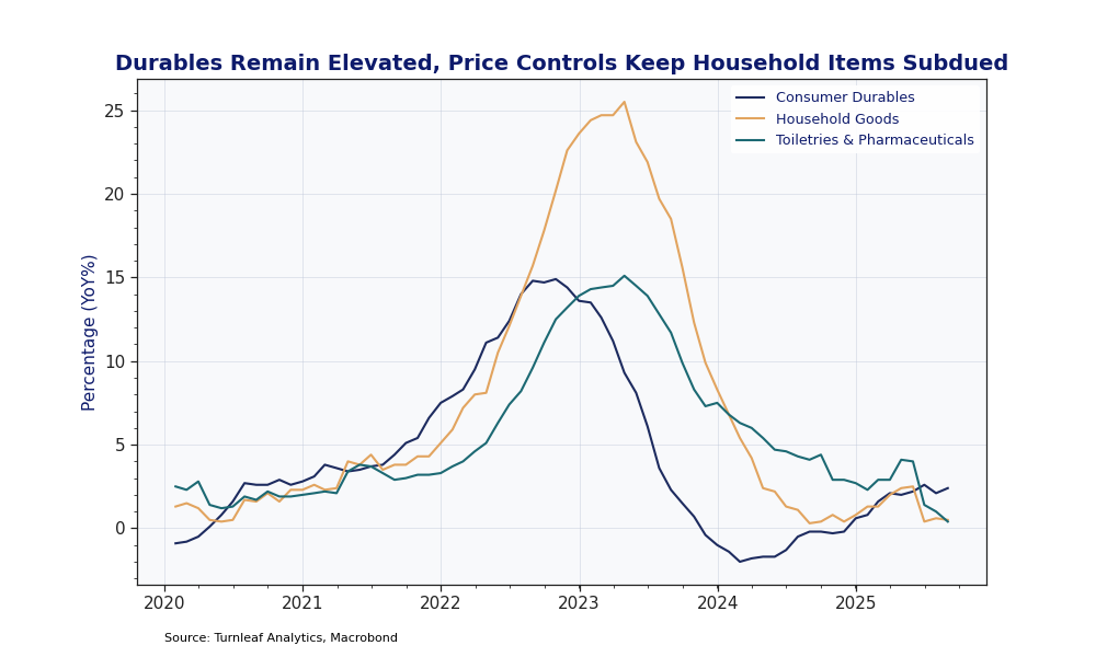 Turnleaf’s September 2025 headline inflation forecast for Hungary over the next 12 months points to an uptick toward 5% YoY by October 2025, followed by a steady decline into early 2026, with the trend reverting toward 4% YoY over the rest of 2026. With the Orban administration’s campaign against unfair retail pricing still in force for another two months and global energy prices subdued, we attribute this profile primarily to underlying pressures in core subcomponents and base effects.