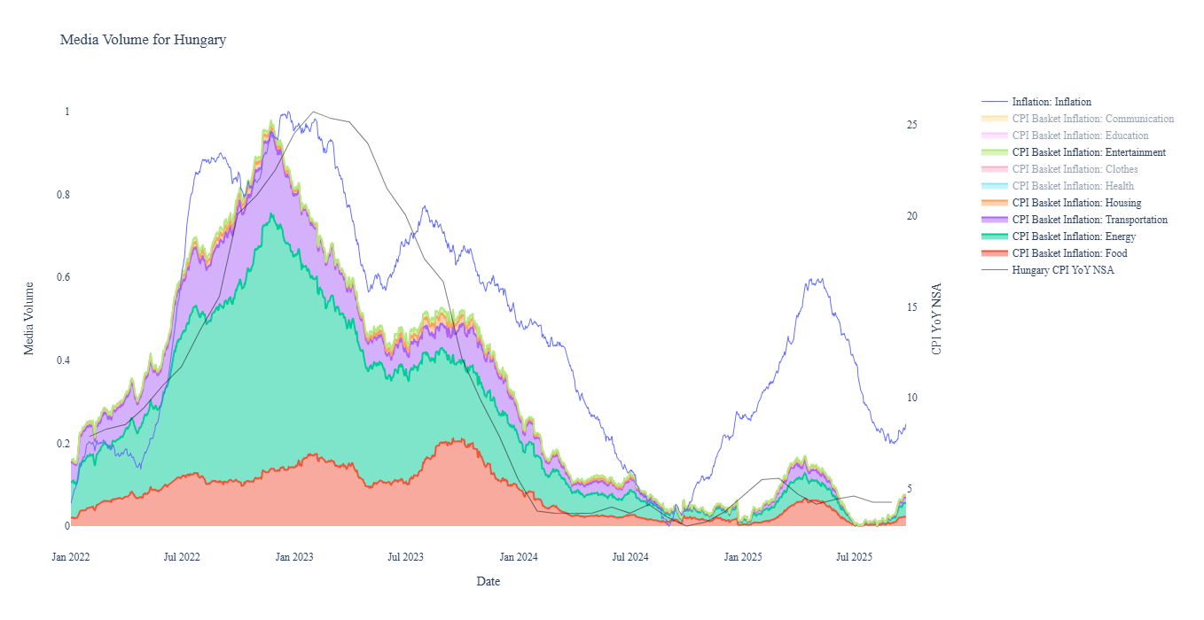 Inflation expectations remain high even with price controls. We see that our CPI Basket Media Volume Aggregate, which measures the total media volume reported relating to words associated with CPI Basket components, and the Inflation Media Volume, which measures the volume of media relating to the word ‘inflation’, is increasing in recent months for Hungary (Figure 1). This suggests that inflation concerns are reemerging as consumers begin to understand that price controls are temporary and that they should be expecting higher prices soon.