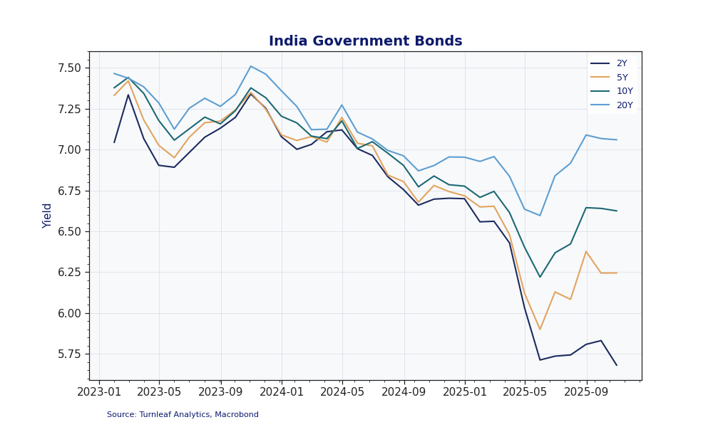 The rupee weakened to 89.39 INR/USD as of November 27, 2025, down 5.82% over twelve months and 1.30% in November alone, driven by acute trade frictions with the U.S. and foreign portfolio outflows. Over the past month, 5- and 10-year government bond yields have edged higher while the 2-year remains near cycle lows, indicating that markets are demanding a higher term premium for inflation and fiscal risks even as they continue to price in near-term RBI easing (Figure 3).
