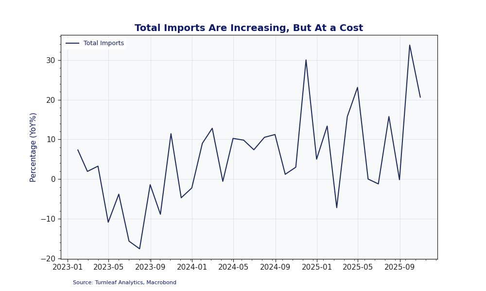 Currency depreciation compounds external cost pressures through dollar-denominated freight and commodity prices, effectively hitting India twice. With global shipping costs still slightly above pre-shock norms, imports are more expensive both because of higher USD prices and the weaker rupee. Despite some slowdown after a peak above 30% YoY in September 2025, import volumes—equivalent to 23.5% of GDP in 2024—continue to grow, reinforcing the upside risk to India’s inflation outlook into 2026 (Figure 5).
