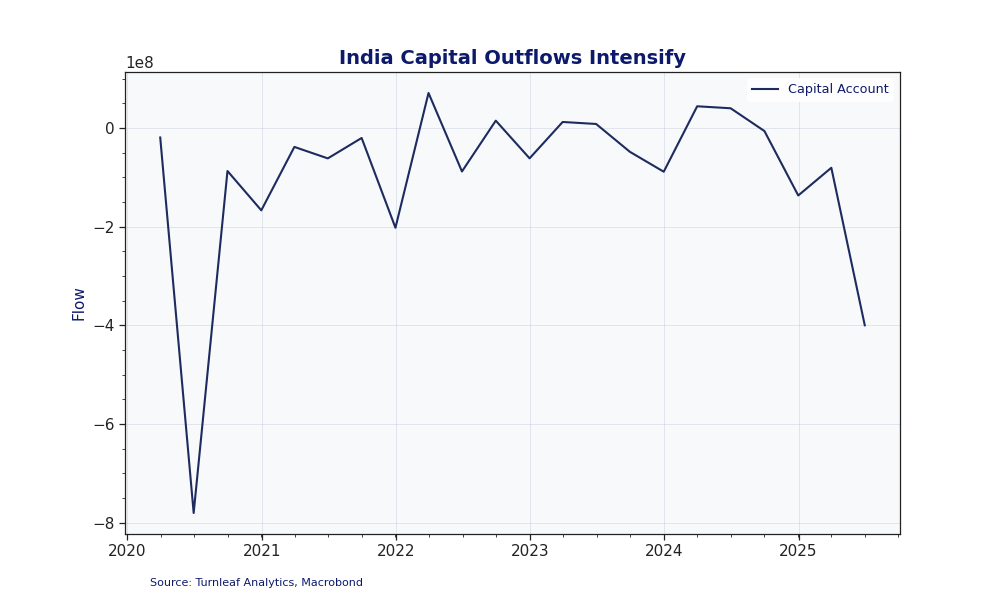 Capital flows show about $400 million leaving India in 2025Q2 as global trade volatility weakened appetite for emerging-market risk (Figure 4). For India, this pressure has been amplified by the U.S. decision to impose a 50% tariff in response to India’s deepening energy ties with Russia. Since the start of the war in Ukraine in 2022, Russia’s share of India’s crude imports has jumped from under 1% to nearly 40%, increasing India’s exposure to geopolitical shocks.