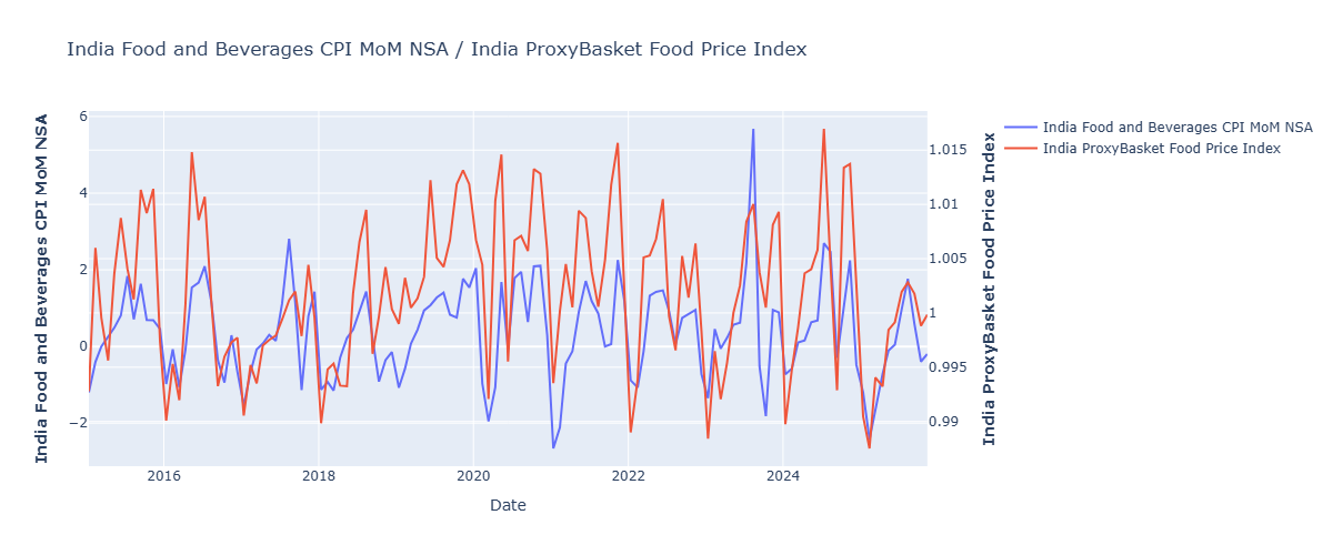 India’s headline CPI inflation slowed to 0.25% YoY in October 2025, largely because food inflation fell to -5.02% YoY. The decline was concentrated in vegetables—especially tomatoes, onions and potatoes—as prices normalized after mid-year supply shocks. Turnleaf’s ProxyBasket Food Price Index captured this move by incorporating daily tomato, onion and potato prices, as well as other inputs like India Agricultural Index that help trigger supply interventions and minimum sell prices for farmers (Figure 2).