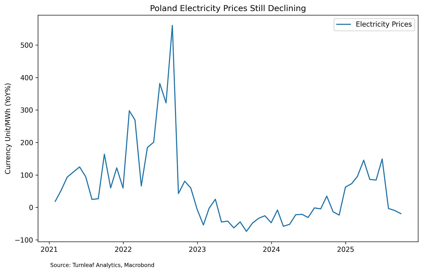 The electricity price cap in Poland, initially set to end by October 2025, has been extended through the end of the year, helping to keep electricity prices subdued for the foreseeable future (Figure 1). Meanwhile, fuel costs remain low due to a drop in global Brent crude prices. However, upside risks remain, particularly if geopolitical tensions or supply disruptions drive prices up in the latter half of 2025 or into 2026.