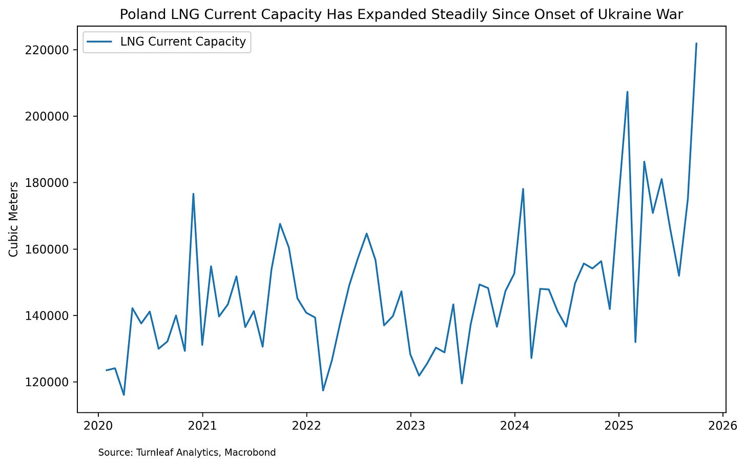 As part of its strategy to decouple from Russian gas, Poland has focused on expanding LNG capacity to diversify its energy mix and ensure greater energy security (Figure 2). However, with favorable base effects from high energy prices fading from the 2026 inflation calculations, gas prices could rise again if supply conditions do not improve. While the expansion of LNG infrastructure is a positive step, Poland’s energy future will depend on securing consistent and affordable energy supplies, with risks of price volatility if supply disruptions or insufficient capacity arise.