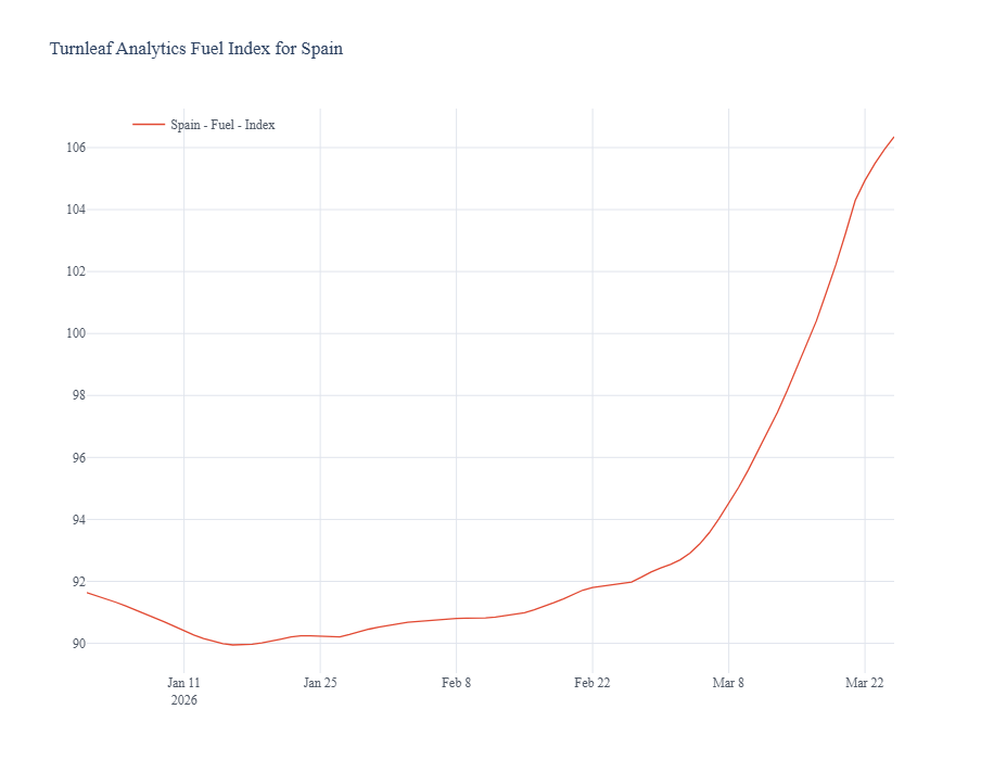 For electricity, Turnleaf’s proprietary PVPC-based index—capturing hourly market-driven price movements but excluding taxes—pointed to a sharp increase in underlying prices from the start of the month (Figure 2). However, the model initially assumed a 21% VAT rate. Late in March 2026, Spain implemented emergency tax cuts, reducing VAT to 10% and the electricity excise to 0.5%, effective immediately. As a result, the observed CPI path diverged from underlying price dynamics, making the timing and pass-through of these tax changes central to explaining the downside surprise in headline inflation.