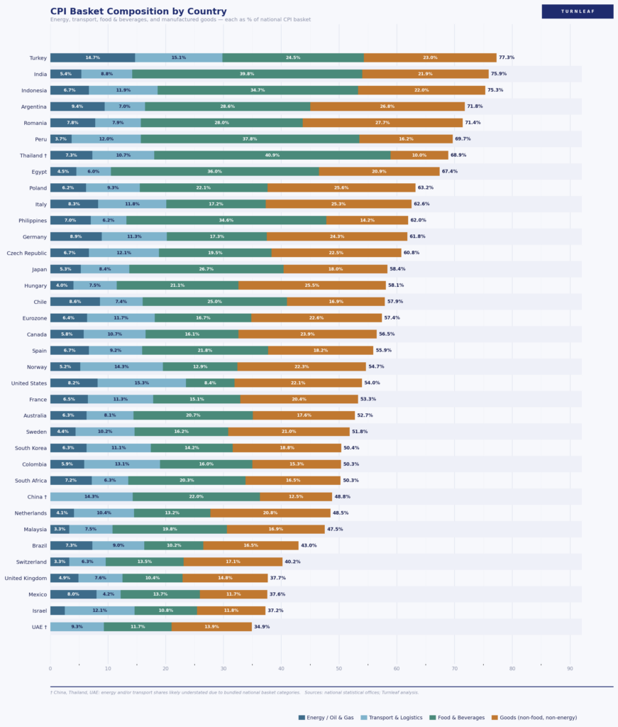 The chart shows that the Hormuz shock will not look the same everywhere. Turkey, India, Indonesia, Argentina, and Romania have the largest combined exposure, with more than 70% of their CPI baskets tied to these channels. Turkey is especially exposed through energy and transport, making it vulnerable to near-term increases in fuel, utilities, and freight. The United States has lower food exposure but one of the highest transport shares, so the impact is more likely to appear through gasoline, airfares, logistics, and delivery costs. By contrast, India, Thailand, Peru, Egypt, and the Philippines are more exposed through food, where price increases may arrive later but carry greater social and political weight because food represents a larger share of household spending.