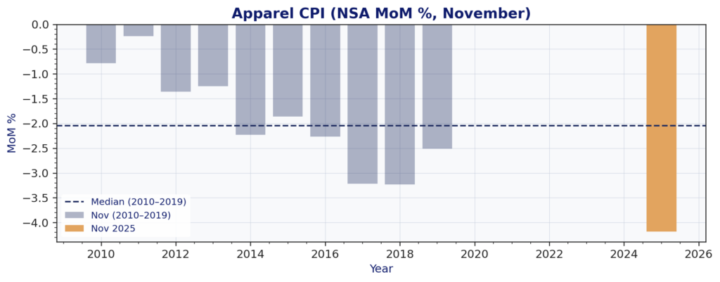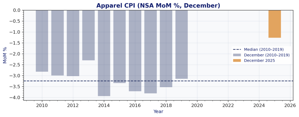 December 2025 makes clear that November’s apparent weakness was largely an artifact of shutdown timing, Black Friday promotional distortions, and compressed data windows, particularly in the most exposed categories. A mechanical rebound was therefore a high-probability, almost inevitable outcome. At the same time, December’s weakness in communication and used vehicles warns against over-attributing the entire CPI path to technical factors. Some normalization is occurring as measurement distortions fade, but the underlying inflation trend still depends on what happens once these shutdown echo effects fully pass through the data.