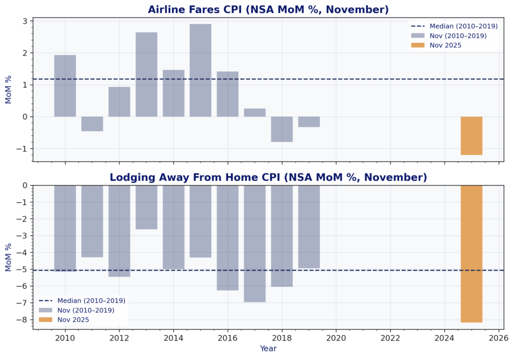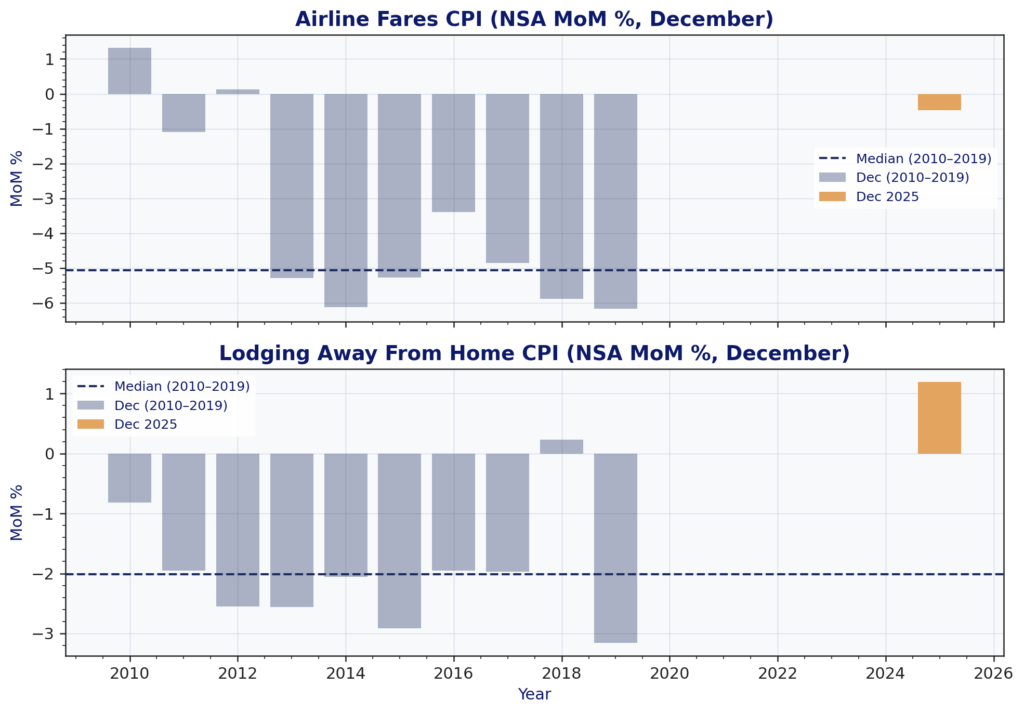 The December 2025 CPI release provides insight into how these distortions unwound. Headline CPI rose 0.3% MoM (SA) and 2.7% YoY, with core CPI up 0.2% MoM (SA) and 2.6% YoY. More importantly, the composition of December inflation aligns with a rebound where the distortion was concentrated. Categories most exposed to timing effects and promotional seasonality strengthened materially. Lodging away from home rose 2.9% MoM (SA), airline fares rose 5.2%, and apparel rose 0.6% (Figure 1). In our historical month-of-year comparisons, these categories moved from unusually weak November outcomes toward more typical December behavior, consistent with Black Friday discounting effects fading and collection timing normalizing.