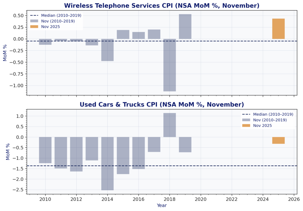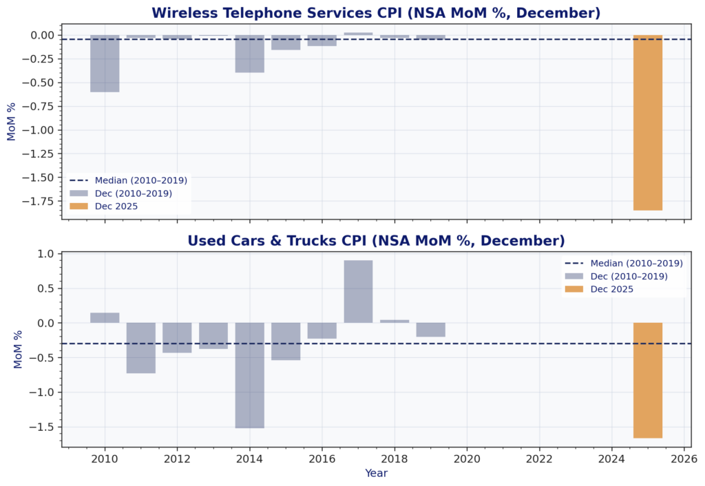 The sharp decline in wireless telephone services warrants particular attention. While BLS switched to alternative data sources and hedonic quality adjustment methods for this category starting in July 2025, the December decline appears to reflect genuine competitive dynamics. In early December, Verizon introduced aggressive promotional pricing that reduced rates for multi-line accounts across its Unlimited plans with three-year price locks. This competitive repricing, captured by BLS’s new alternative data methodology, likely explains much of the December decline in wireless services. Similarly, the decline in used vehicle prices appears to reflect legitimate market softening.