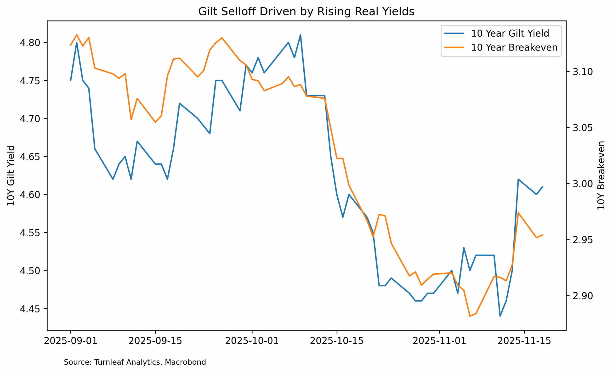 Despite the Bank of England’s continued hawkish stance and a Bank Rate of 4%, inflation has remained elevated relative to other advanced economies, leaving markets cautious about the UK’s policy credibility. Structural pressures—particularly in services, where labour-cost growth has been persistent—have kept underlying price dynamics sticky. Food price inflation has also proven volatile, complicating the near-term trajectory. Although sentiment toward fiscal discipline has improved, uncertainty surrounding the Budget’s composition has kept investors alert to the risk that fiscal choices could undermine rather than support the disinflation process.